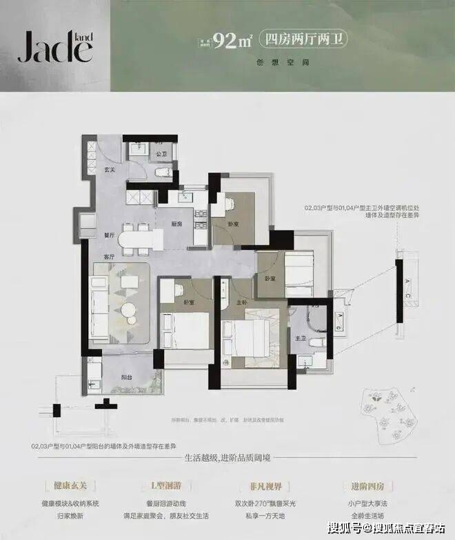 92㎡的4房2厅2卫,设计的是经典竖厅格局,进门入户玄关,客厅3.08米开间,LDKB一体化,S墙设计预留冰箱卡槽位,四开间朝南,有2个次卧270度飘窗,L型灵动式厨房,卫生间干湿分离,得房率约91.5%(包含赠送),东南朝向。