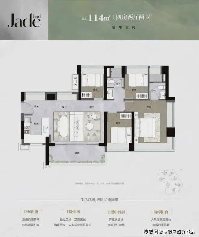 114平㎡的4房2厅2卫,设计的是横厅南北通透格局,进门入户玄关,LDKB一体化,五开间朝南,全屋9面飘窗,主卧大套间,U型厨房,卫生间干湿式分离,得房率约93.18%(包含赠送),阳台主朝东南向。