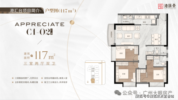117㎡三房两厅两卫,阳台飘台视野广,无界风光,主卧奢配衣帽间,私藏优雅双阳台向阳,美景釆光入室,客卫三分离设计,井井有序