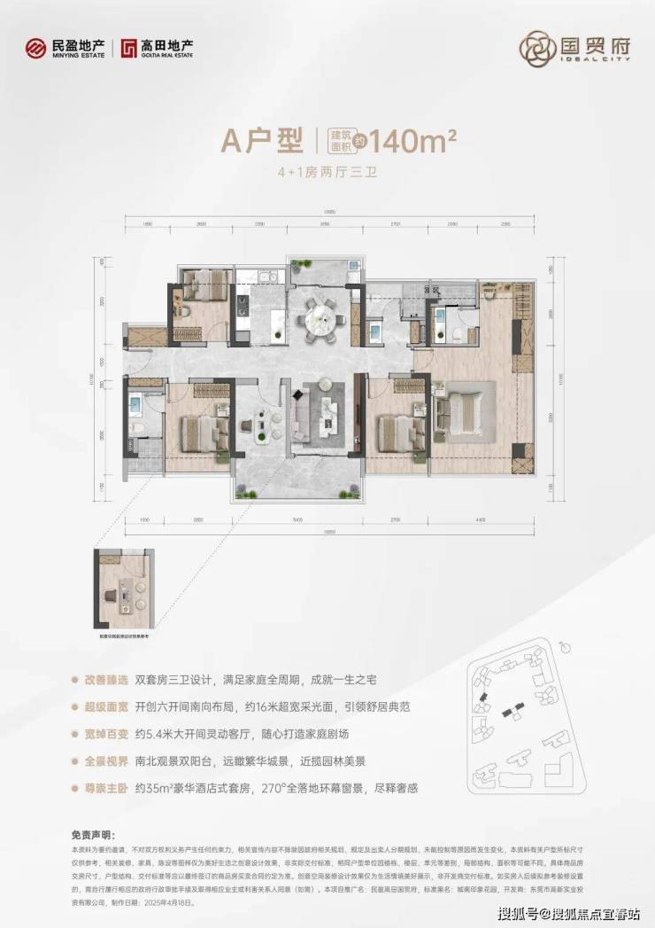 𝐀 户型|约𝟭𝟰𝟬㎡4+1房两厅三卫,实用率约100%。