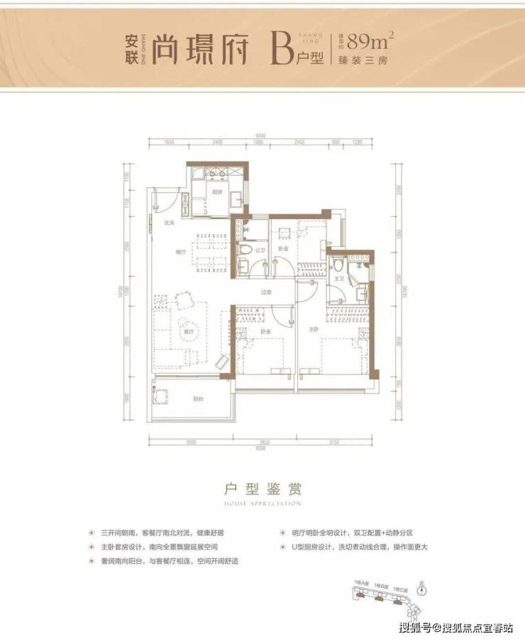 建筑面积约89㎡户型,动静分区布局,主要生活空间南向,全尺寸采光面日照、采光充足。客厅带有1.8米进深阳台,功能全面。主卧空间宽敞舒适,次卧空间紧凑实用。餐厨空间联系紧密,U型厨房自然通风采光,功能布局合理。