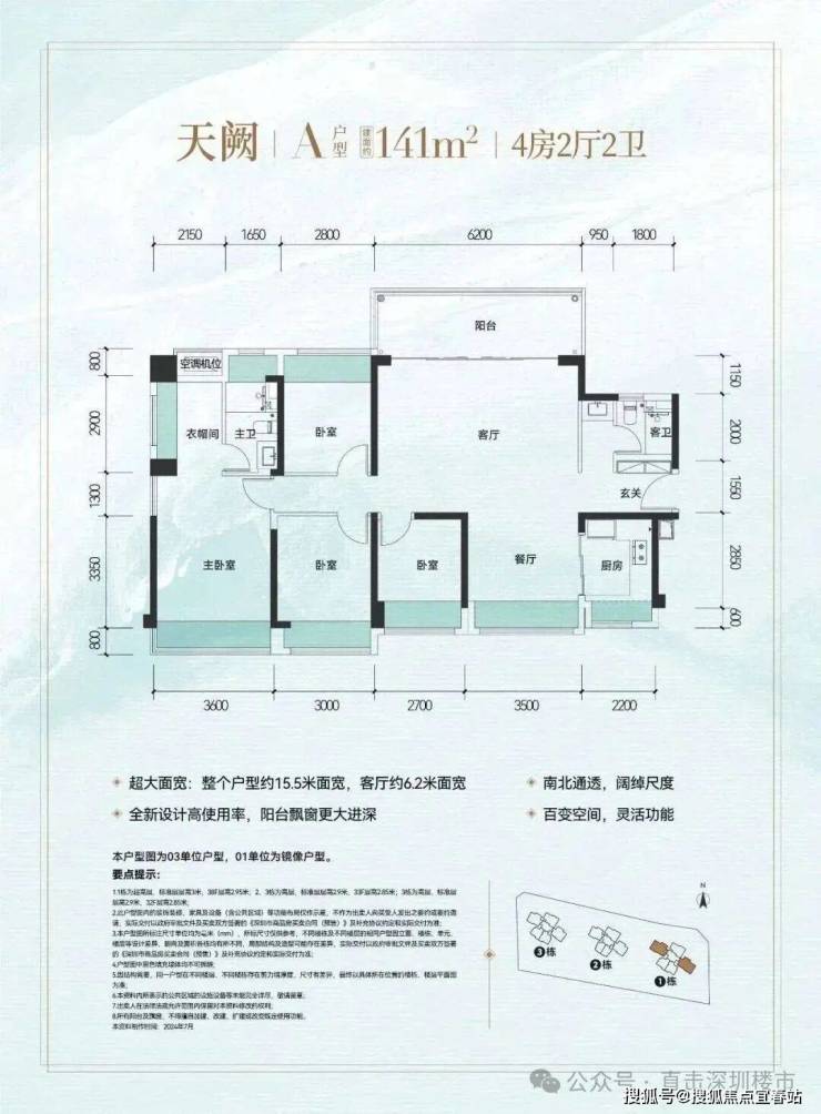 141㎡的4房2厅2卫,设计的是横厅南北通透格局,进门入户玄关,超宽客厅6.2米的开间,五开间朝南,4个卧室分别做到了主卧19.62㎡/次卧12.45㎡/次卧10.36㎡/次卧9.04㎡(包含墙体飘窗),主卧大套房设计,U型厨房,公卫三段式分离设计,得房率约:81.4%(不含赠送),阳台主朝东北向,看科学公园景观。
