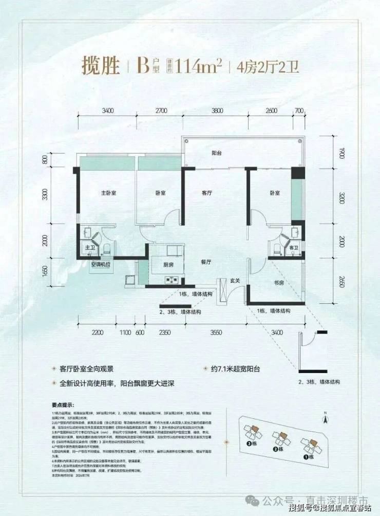 113㎡的4房2厅2卫,设计的是竖厅双龙抱珠格局,进门入户玄关,客厅3.8米的开间,LDKB一体化设计,4个卧室分别做到了主卧17.34㎡/次卧11.07㎡/次卧10.56㎡/次卧9.01㎡(包含墙体飘窗),客厅连接次卧出7米长的观景大阳台,U型厨房,得房率约:81.78%(不含赠送),东北朝向看科学公园。