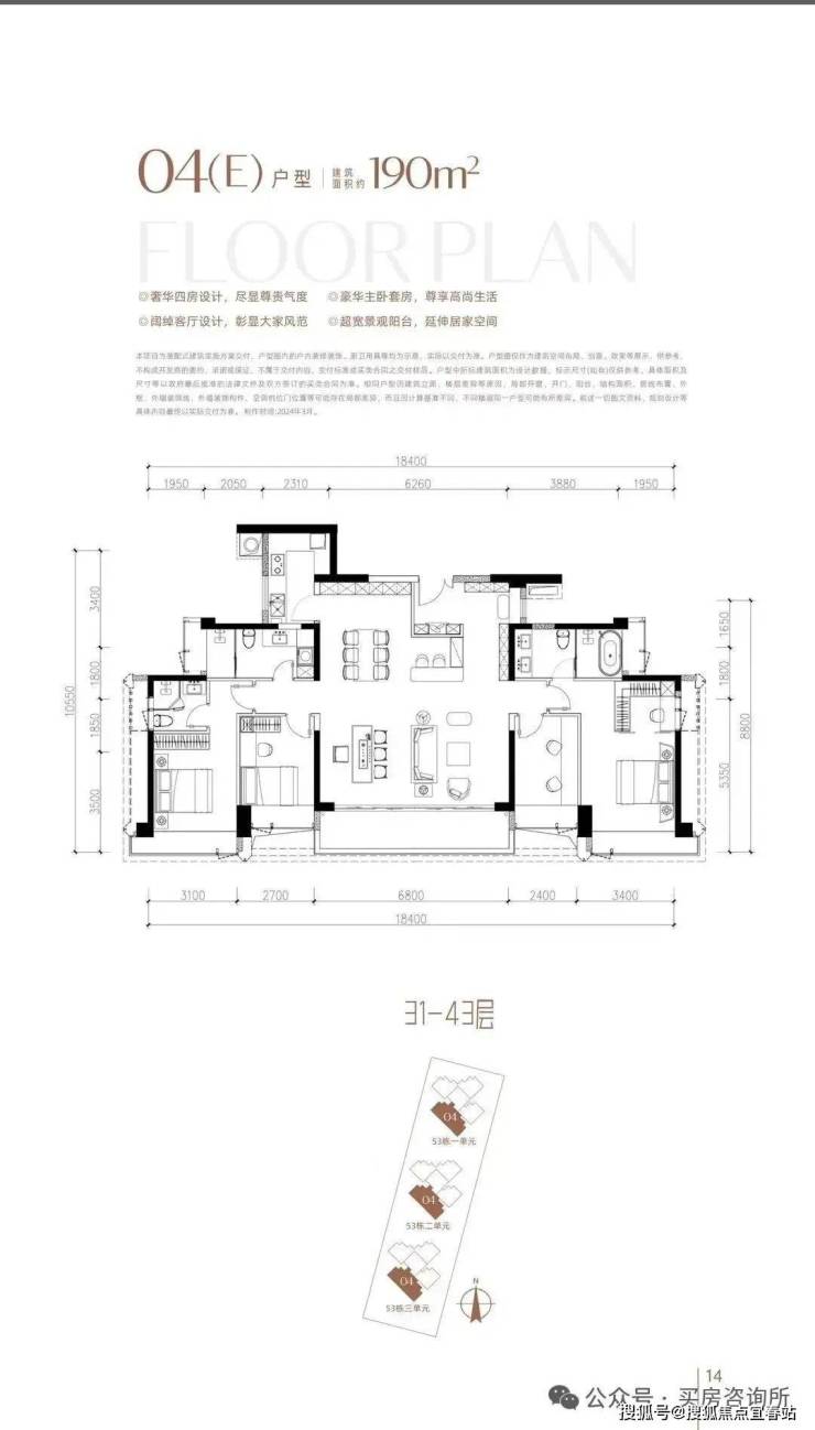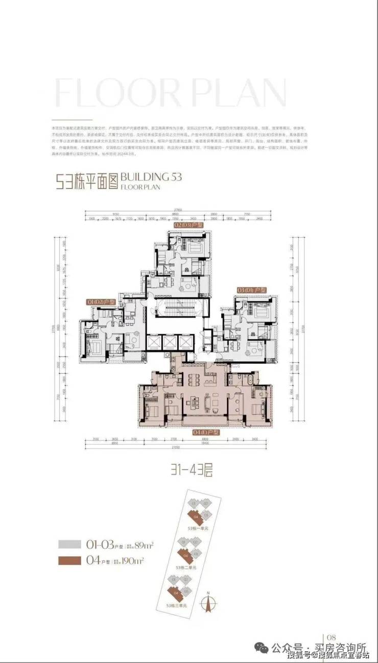 其中53栋3单元5-29层为三梯五户,都是89平三房。31-43层为三梯四户,其中3户为89平三房,1户为190平四房。这一栋也是小户型当中最好的一栋,89的01以及29楼以下得0405户型以及190㎡高楼层是可以看到海景的