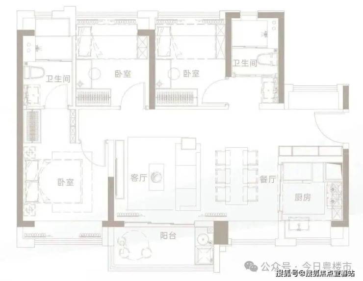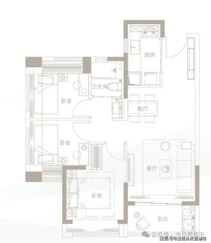 此户型为三面采光格局,整体空间明亮通透。L型厨房设计合理,操作便捷;明厨明卫,双面采光卧室,营造舒适的起居环境。该户型非常适合首次置业或预算有限的刚需家庭,在有限面积内实现了三房的功能性。