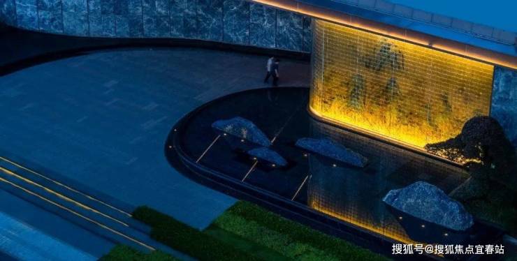 沿着门庭进入社区,映入眼帘的是第二重归家礼序,也是由《千里江山图》意境延伸而来的玻璃景墙屏风。此屏风的设计含蓄内敛,“藏”而不露,让穿梭于城市繁华的业主沉浸式置身自然而艺术的美学归家之旅,卸下紧绷的情绪,回归低密环境之中。