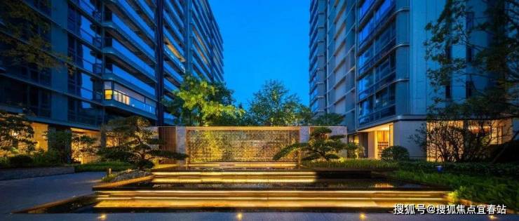 归家的第一重礼序,从70米超宽界面的酒店式落客门庭开始。大面积素净弧形背景墙配合金属铝板天花,成为了恢弘大气的门庭基调。同时,迎宾水景搭配珍贵的罗汉松等植物组团,叠山造景,在一动一静中巧妙地把社区外部的繁华闹市和内部的静谧园林区隔开来,使建筑和景观相辅相成,营造出深邃又流畅的灵动之美。