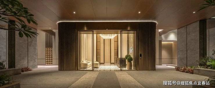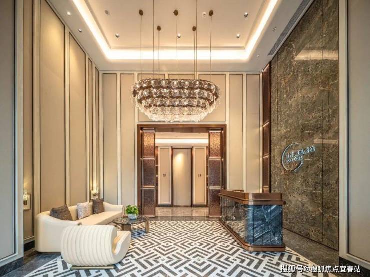 地面入户大堂的通高玻璃门和香槟色金属格栅搭配艺术吊灯和地面拼花瓷砖,让归家大堂整体通透大气且兼具艺术感。