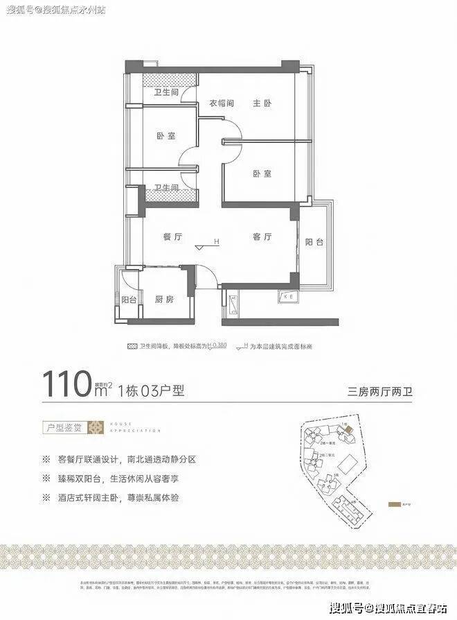 110㎡户型:三开间朝南,主卧宽3.4米,客厅连通景观阳台(南向),北向阳台可眺望梅林山景,得房率约74.81%