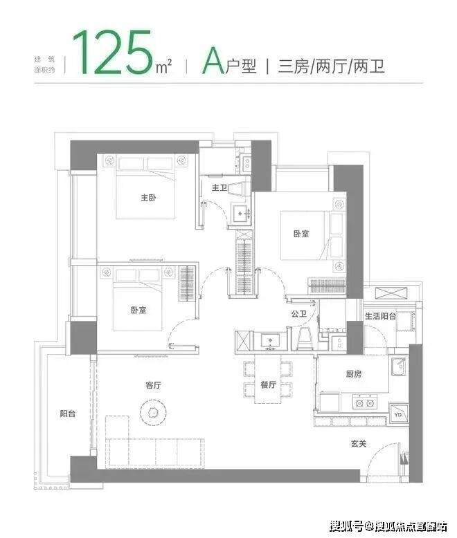 125㎡A 户型三房两厅两卫:为经典的三房两厅两卫竖厅设计,是货量最多的户型,有东南、西南等朝向。该户型飘窗、阳台设计可拉开居住视野,LDK 一体化设计打造了无边界、社交化的餐客厨系统。双阳台设计,厨房连通生活阳台,延展更多空间,便于收纳。