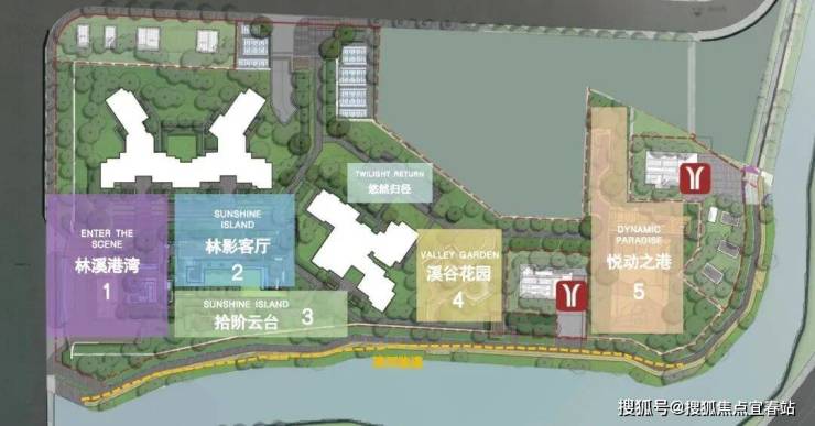 整个滨水园林包括了5大功能区,主入口的林溪港湾、拾阶云台、漂浮会客庭院、亲子儿童乐园(即溪谷花园)、配置羽毛球和篮球场的悦动之港,真正做到了一步即一景。
