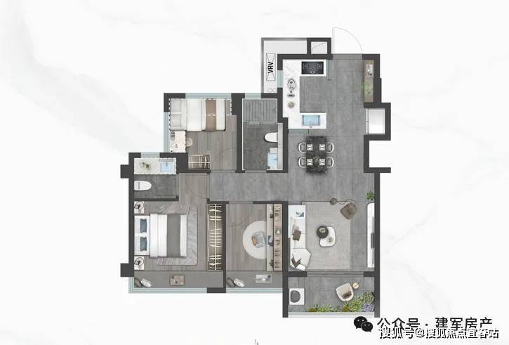 80㎡的3房2厅1.9卫,设计的是竖厅格局,客厅开间3.4米,LDKB一体化,S墙设计预留冰箱位,U型半开放式厨房,创新式1.9卫设计,得房率:78.99%(不含赠送),有西北、西南、东北、东南4个朝向。