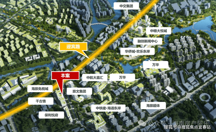 项目位于三亚市吉阳区迎宾路(海旅免税城北侧)。随着自由贸易港政策落地,在总部经济及中央商务区规划中,东岸单元作为建设大型综合消费商圈+总部经济核心区。汇集中粮、中交、保利、中航、中铁建、五矿等世界500强企业,已成为三亚城市功能上的中轴城心,凝聚着最重要的部门,昭示着三亚未来发展的方向,区域价值未来可期。