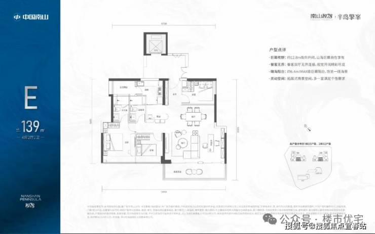 139㎡的4房2厅2卫,1栋03/2栋02高区户型,电梯入户送独立公区,设计的是竖厅类双龙抱珠格局,四开间朝南,主卧大套间设计,有1个多功能间可以做书房,6.4米长观景大阳台,L型厨房带1个生活阳台,卫生间干湿分离,得房率:72.07%(不含赠送),西南朝向。