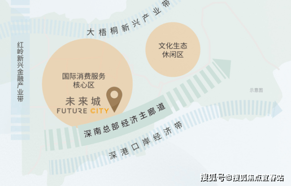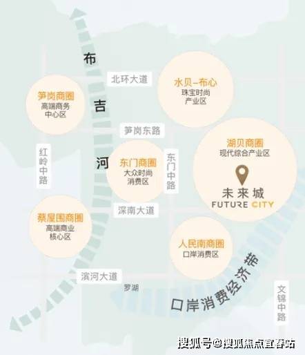未来城项目占位深南大道中轴,沿路两侧经济、产业高度聚集,凝聚总部经济、金融业、现代服务业等产业,形成势能强劲的深南总部经济主廊道,擎动罗湖发展脉搏。