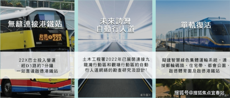 【交通】:15分钟内掌握香港三大核心商业区及西九龙项目距离港铁沙中线启德站约10分钟步程,步行至港铁彩虹站则约16至20分钟。而于承丰道设有多条巴士路线,来往启德邮轮码头至九龙塘(又一城)、九龙城、九龙湾及观塘;而启德桥附近另有86号小巴,提供往来启德邮轮码头至MegaBox、德福花园等。