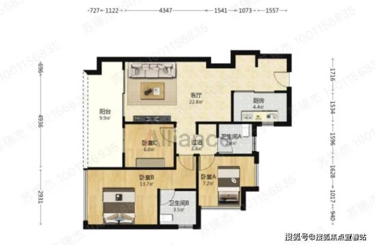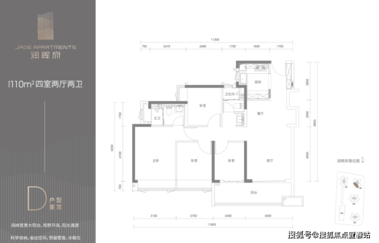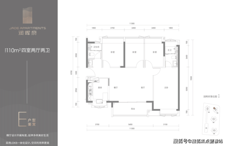 E户型是110㎡四房二卫横厅户型,则是B户型的放大版。西南朝向,户型方正,三个次卧的面积均在9平米以上,主卧18平左右。再加上双面采光对流,基本上不存在采光死角。