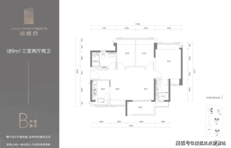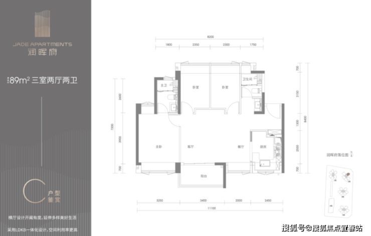 B/C户型为89㎡横厅三房二卫,算是年轻人比较喜欢的户型。朝向分为东南、东北和西北朝向,两者区别在于入户方式及内部格局分布不同。其中从户型入户处嵌入式玄关对比B户型,更兼具实用性、美观性、私密性。