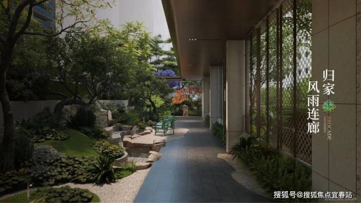 风雨连廊的链接,如一条串联绿城生活的珍珠项链,在“流光溢彩”的氛围中,将绿植水景、休憩平台一一相连,塑造移步异景的立体生态廊道。