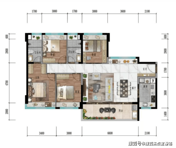 『南北通透双阳台 南向四开间』:118㎡户型 四房两厅两卫