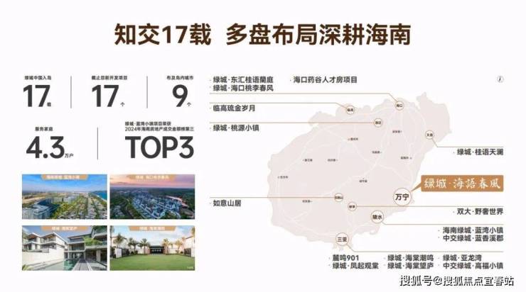 •多盘布局 17载深耕海南 绿城深耕海南17载,从度假到居住的多元化产品线深度布局,同频海南发展,打造多个高端佳宅作品,以超越行业的硬核产品力,在品牌影响力、客户口碑、区域销售业绩等多个方面实现全面领先。