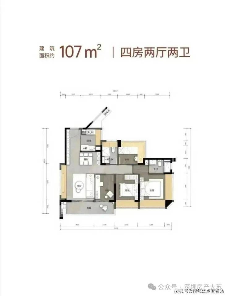 107㎡的4房2厅2卫,设计的是经典竖厅格局,客厅4米开间,LDKB一体化,S墙设计预留冰箱卡槽位,动静分区,分别做到了主卧17.18㎡/次卧11.2㎡/次卧8.64m²/次卧7.68㎡(包含墙体飘窗),U型厨房,卫生间干湿分离,得房率约79.6%(不含赠送),客厅连接次卧出10.24m²观景大阳台,东南朝向。套内面积85.19m²+赠送面积22.96m²=实用面积108.15m²,加上赠送面积后得房率101.08%。
