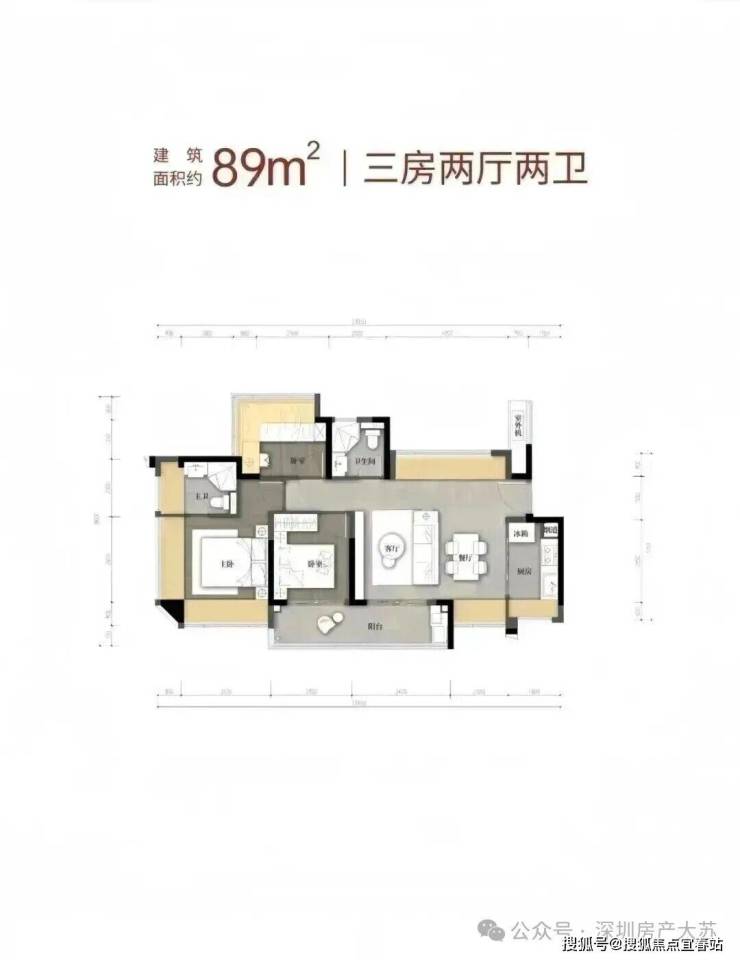 89㎡的3房2厅2卫,1栋04户型,设计的是横厅南北通透格局,客餐厅5.4米开间,LDKB一体化设计,分别做到了主卧16.02㎡/次卧9.07m²/次卧8.26㎡(包含墙体飘窗),客厅连接次卧出9.3m²的巨幕大阳台,L型厨房,卫生间干湿分离,得房率约79.6%(不含赠送),阳台主朝西南向。套内面积70.43m²+赠送面积21.17m²=实用面积91.6m²,加上赠送面积后得房率103.55%。
