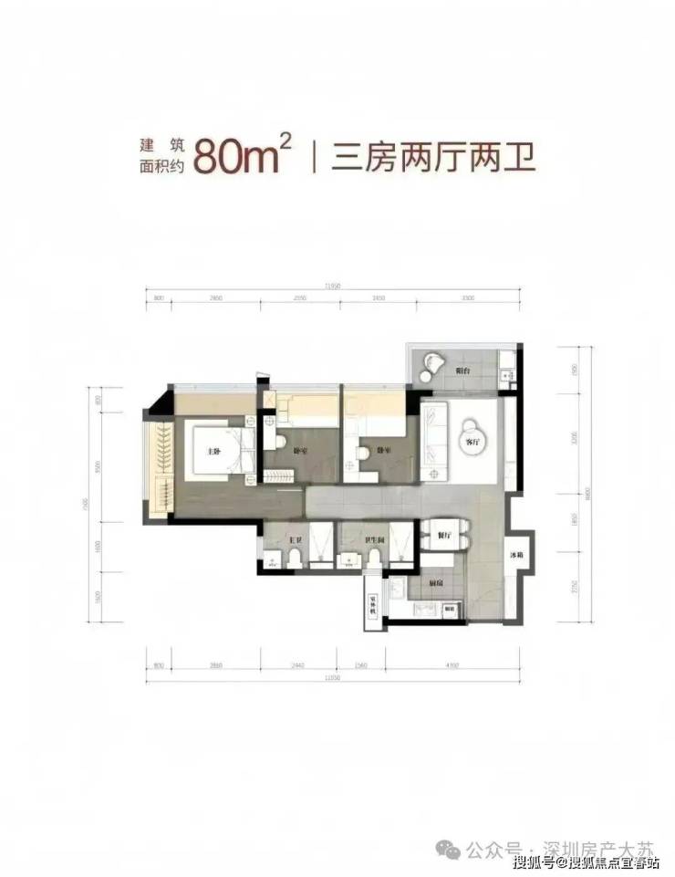 80㎡的3房2厅2卫,设计的是竖厅格局,客厅3.3米开间,LDKB一体化,S墙设计预留冰箱卡槽位,动静分区,分别做到了主卧16.38㎡/次卧8.16㎡/次卧7.84㎡(包含墙体飘窗),U型厨房,卫生间干湿分离,得房率约79.6%(不含赠送),阳台4.95m²东北朝向。套内面积63.98m²+赠送面积11.55m²=实用面积75.53m²,加上赠送面积后得房率94%。