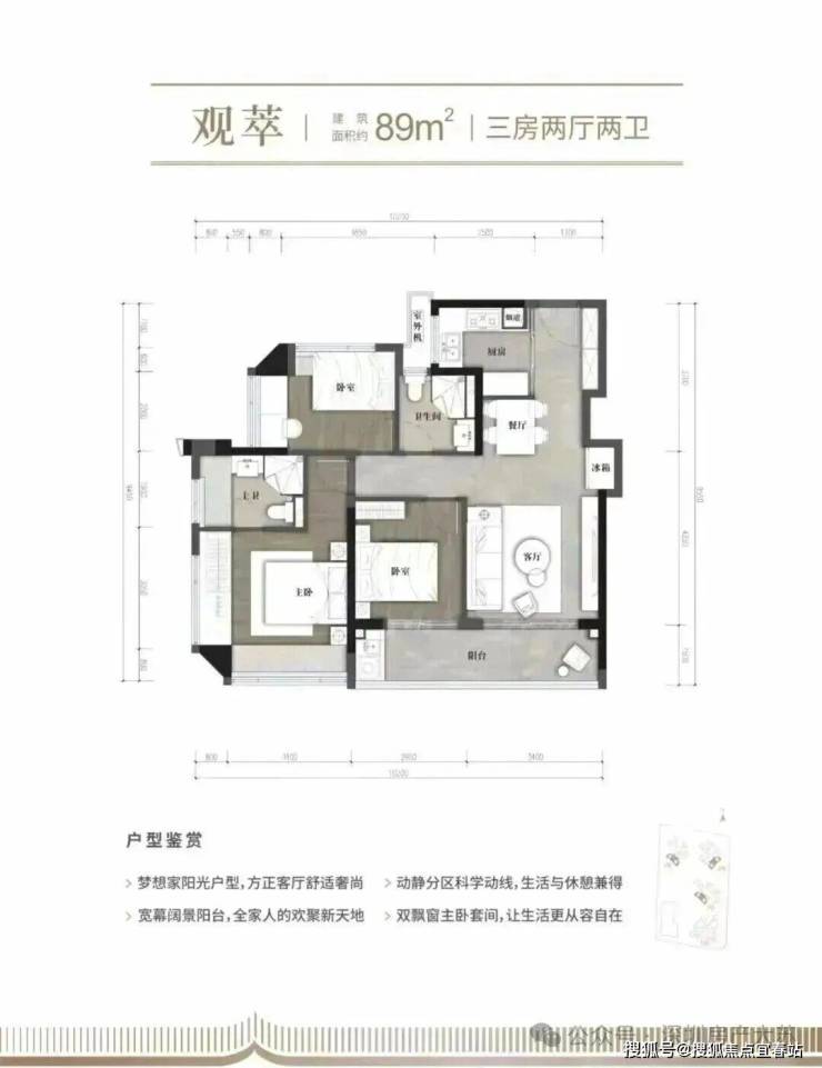 89㎡的3房2厅2卫,1栋02.03户型,设计的是经典竖厅格局,客厅3.4米开间,LDKB一体化,S墙设计预留冰箱卡槽位,动静分区,分别做到了主卧16.28㎡/次卧9.53㎡/次卧9.42㎡(包含墙体飘窗),U型厨房,卫生间干湿分离,得房率约79.6%(不含赠送),客厅连接次卧出9.45m²观景大阳台,西南朝向。套内面积70.43m²+赠送面积14.58m²=实用面积85.01m²,加上赠送面积后得房率96.1%。