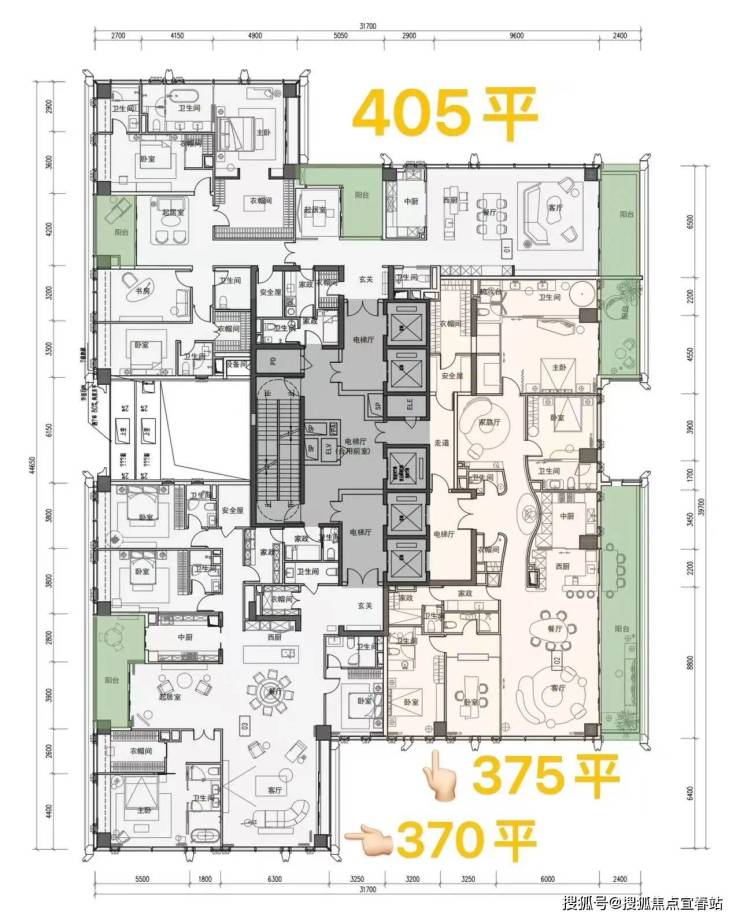 • 高区(42层起,150-200米):约370-375-403㎡4+1房五卫+家庭厅+家政套间