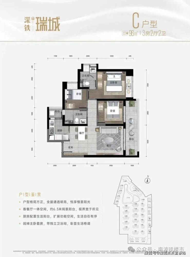 96㎡的3房2厅2卫,C户型,设计的是经典竖厅格局,进门入户玄关,客厅3.5米开间,LDKB一体化设计,动静分区,3个卧室分别做到了主卧12.49㎡/次卧7.3㎡/次卧6.05㎡(实测面积,去掉墙体),客厅连接次卧出6.3米长的阳台,L型厨房还带1个生活阳台,卫生间干湿分离,得房率约:75.76%(不含赠送),东南朝向。