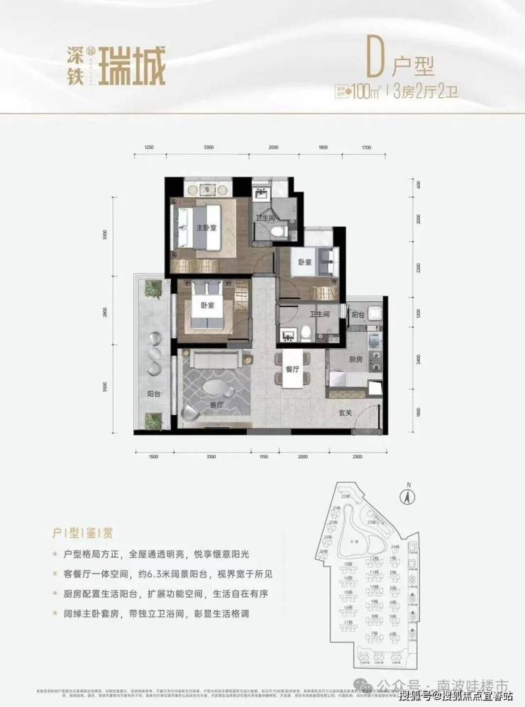 100㎡的3房2厅2卫,D户型,设计的是经典竖厅格局,进门入户玄关,客厅3.5米开间,LDKB一体化设计,动静分区,3个卧室分别做到了主卧12.24㎡/次卧7.54㎡/次卧6.06㎡(实测面积,去掉墙体),客厅连接次卧出6.3米长的阳台,L型厨房还带1个生活阳台,卫生间干湿分离,得房率约:75.76%(不含赠送),西北朝向。