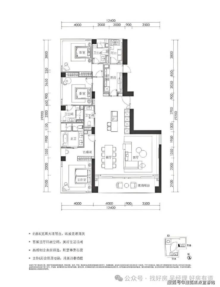 ★280㎡三房两厅四卫:位于1栋三、四单元24-32层,为05、08户型。拥有超8米超宽幕开间,厅出阳台可直面海景。采用三套房设计,主卧配备L形全景落地窗,占据270°最佳观海位。