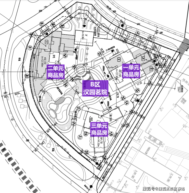 B区由3栋三个单元、裙房组成,其中一二单元层数45层,三单元层数39层,总户数474套;