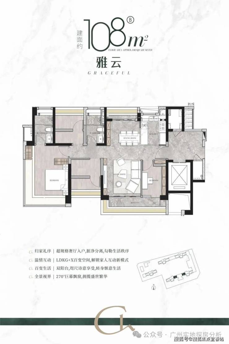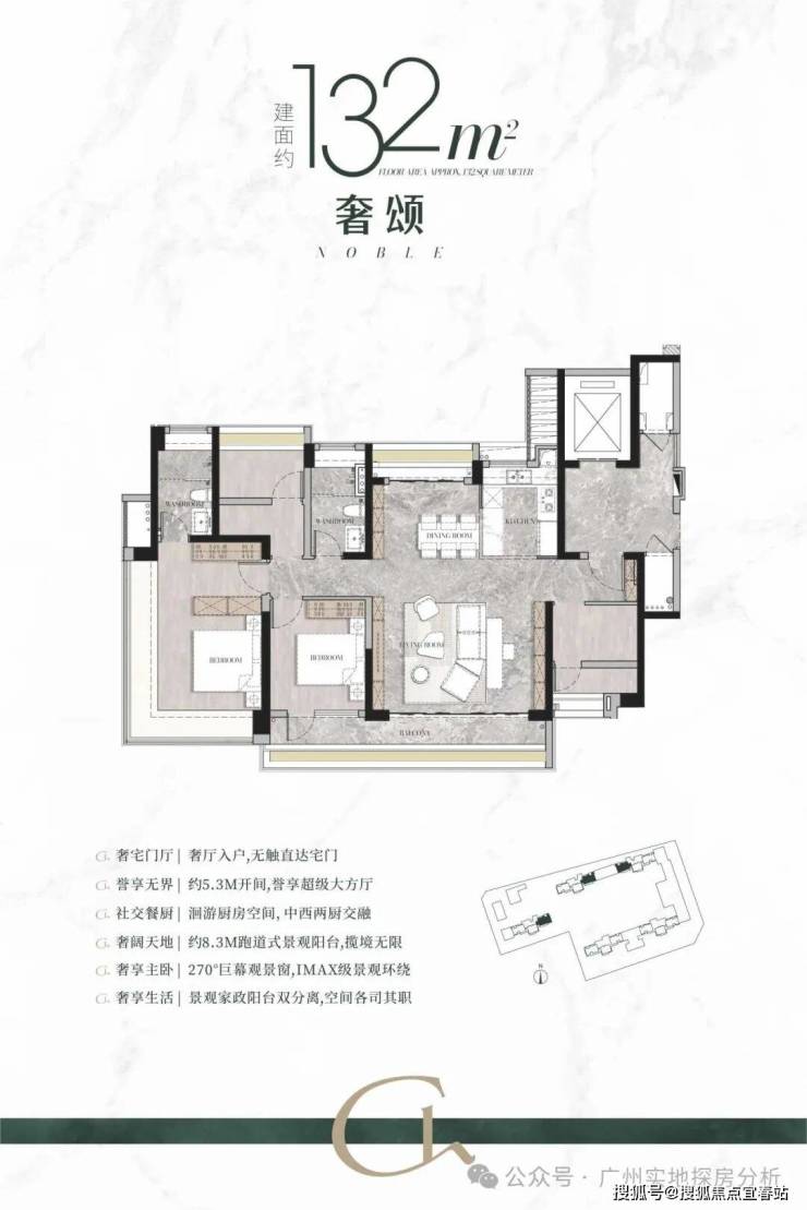 建面132㎡户型,专梯入户,约8.3米跑道型阳台单边位,南北双阳台,LDKG一体化设计,大方厅面宽约5.3米,主卧270度景观飘窗,私密性很好。