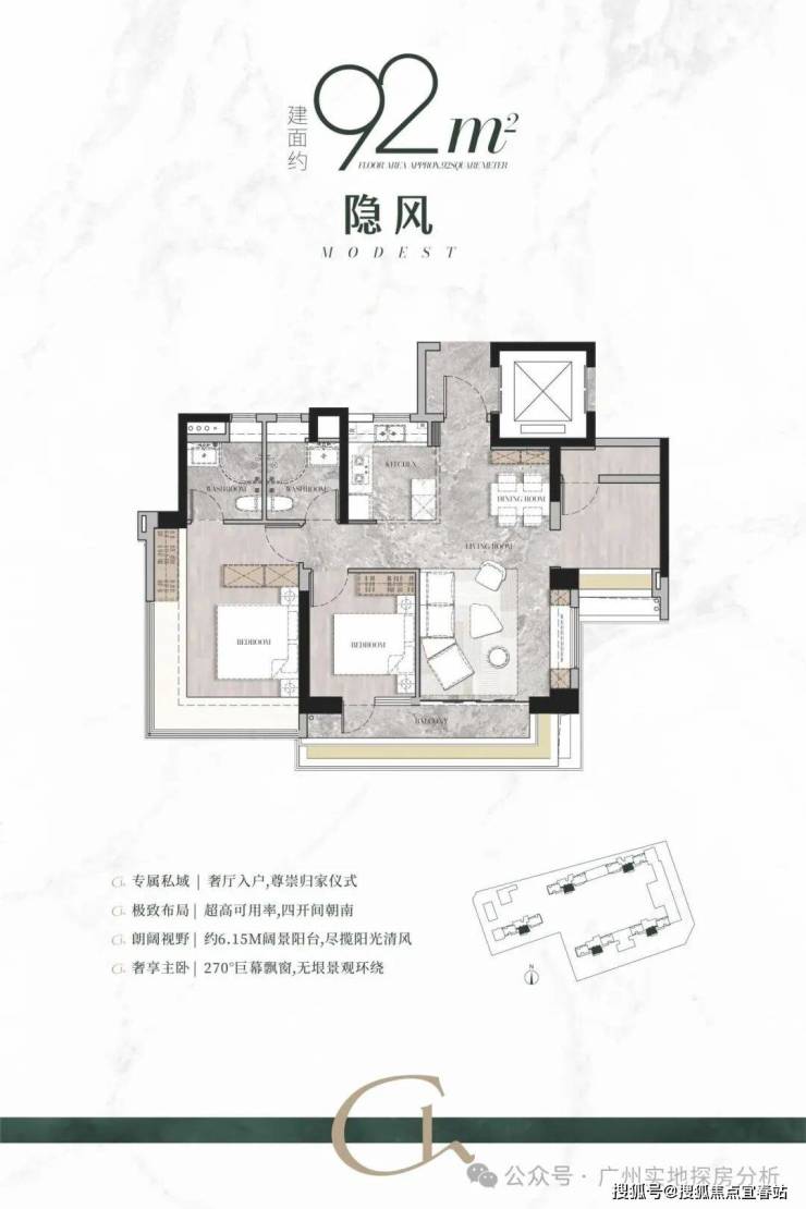 建面92㎡户型,四开间朝南,左右无遮挡,约6.15米大阳台,背景墙位置为飘窗设计,主卧做了270度的景观飘窗,这些都不计入建筑面积。