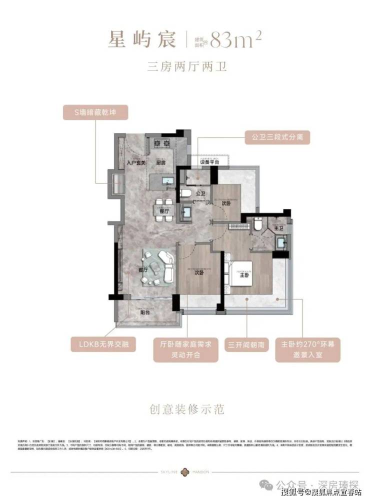 83㎡的3房2厅2卫,设计的是经典竖厅格局,客厅3.35米开间,LDKB一体化,S墙设计预留双开门冰箱卡槽位,三开间朝南,动静分区,分别做到了主卧16.02㎡/次卧9.08㎡/次卧7.01㎡(包含墙体飘窗),U型厨房,公卫三段式干湿分离,赠送1.98平设备平台,得房率约77.9%(不含赠送),套内面积64.28㎡,阳台5.02m²西南或东南朝向。靓点:83平做到了3房2卫,主卧270°无柱转角飘窗,厨房烟道外置+额外赠送设备平台,并且是纯南向格局。