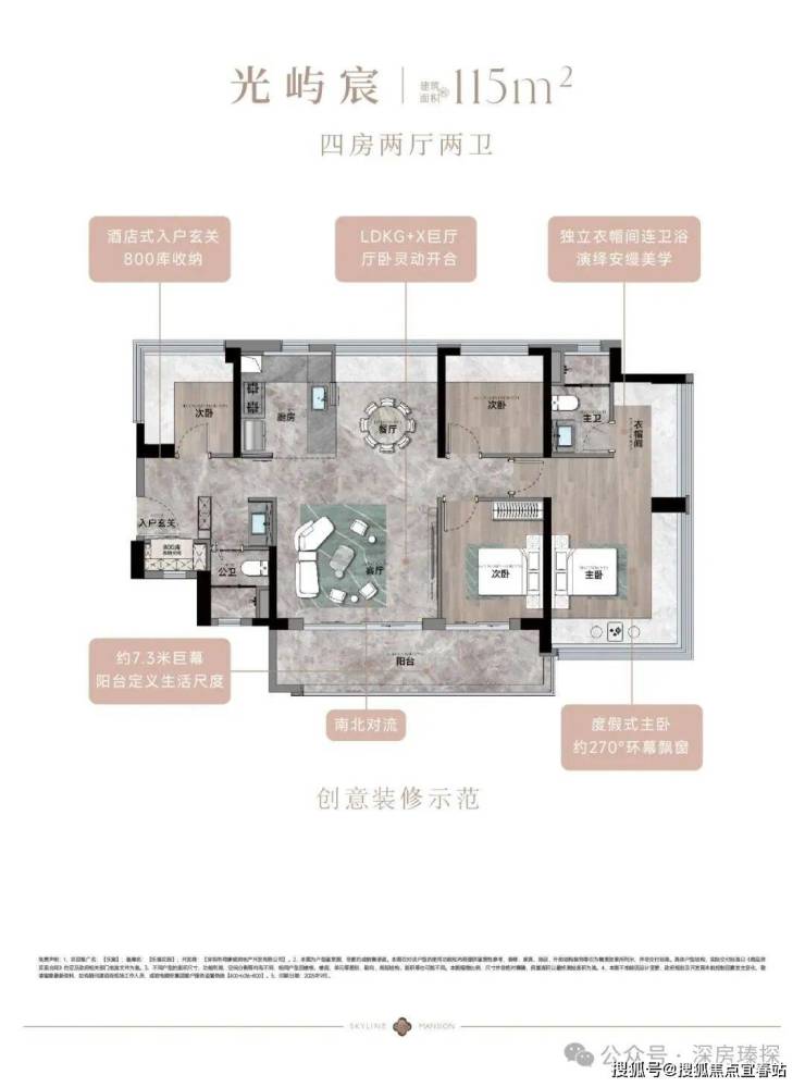 115㎡的4房2厅2卫,设计的是竖厅南北通透格局,进门入户玄关,客厅4.45米开间,餐客厅分离设计,分别做到了主卧23.45㎡/次卧8.96㎡/次卧7.84㎡/次卧7.68㎡(实测面积),客厅连接次卧出10.87m²的观景大阳台,L型中式+岛台灵动式厨房,公卫三段式干湿分离,得房率约77.9-79.5%(不含赠送),套内面积91.17㎡,阳台主朝东南或西南向。靓点:南北对流+7.25米长超大观景南向阳台,超大主卧+270°无柱转角飘窗+进门独立玄关800库。