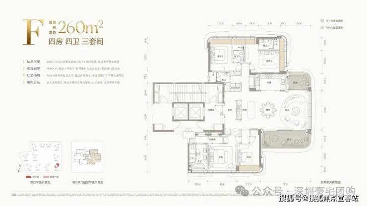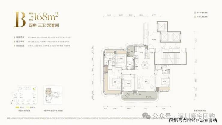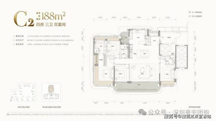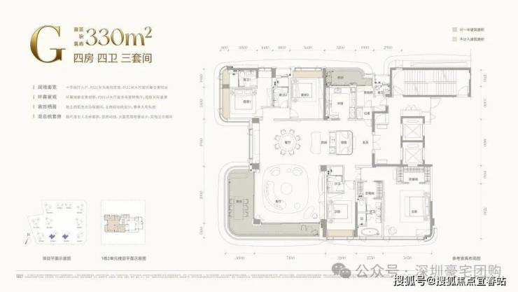 :主推143–332㎡大平层,层高 3.15–3.3 米,得房率近100%。