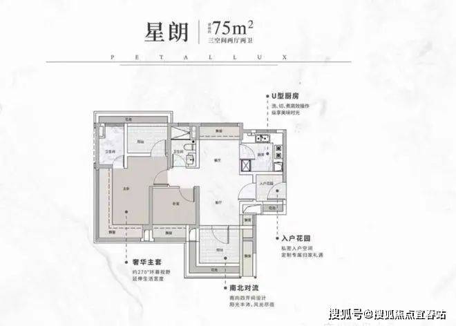 户型设计主打高实用性与空间灵活性:75㎡三房采用南北对流设计,U 型厨房搭配独立玄关,主卧配备 270° 环幕飘窗;