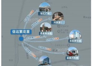 信达繁花里的商业配套成熟度高,项目周边 1 公里内有易发商业街、钻汇广场、奥园广场等传统商圈