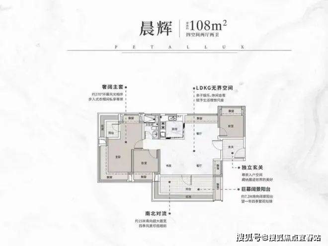 108㎡四房拥有约 15 米南向面宽,7.2 米巨幕阳台与双套间设计,适合多孩家庭或改善型需求。