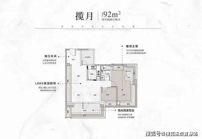 92㎡四房实现 LDKG 一体化布局,约 6.4 米南向阳台与步入式衣帽间提升居住舒适度;
