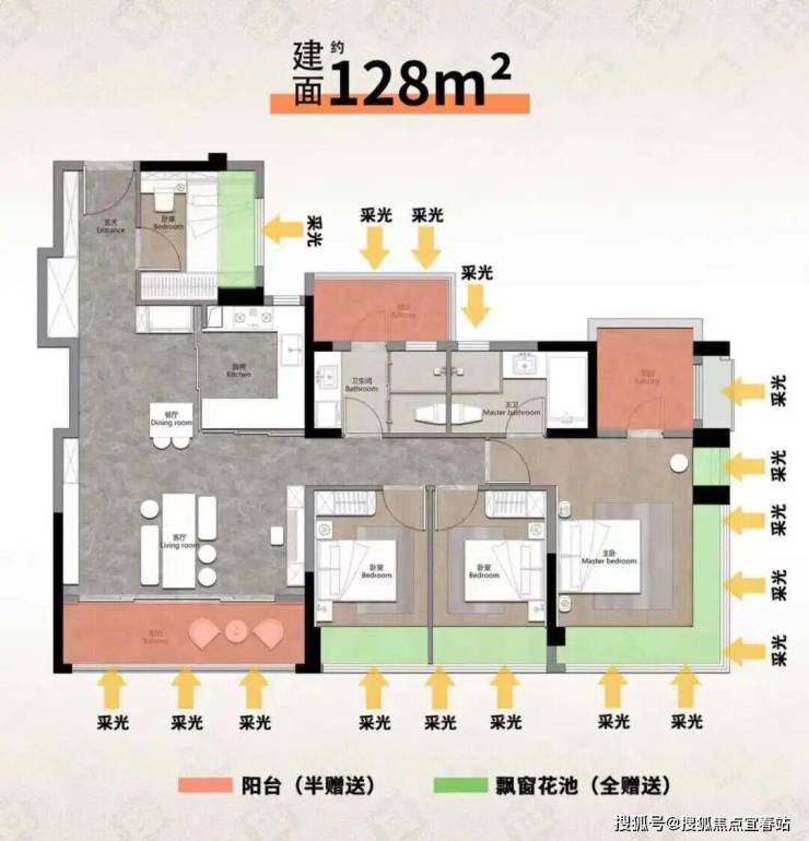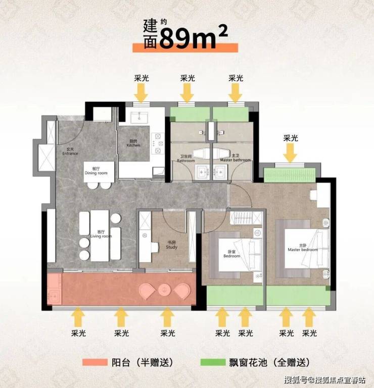 约89㎡三房两卫户型:虽然是入门级产品,却已站上同面积段的品质天花板。四开间全南向采光、近4m客厅、6.4m阳台