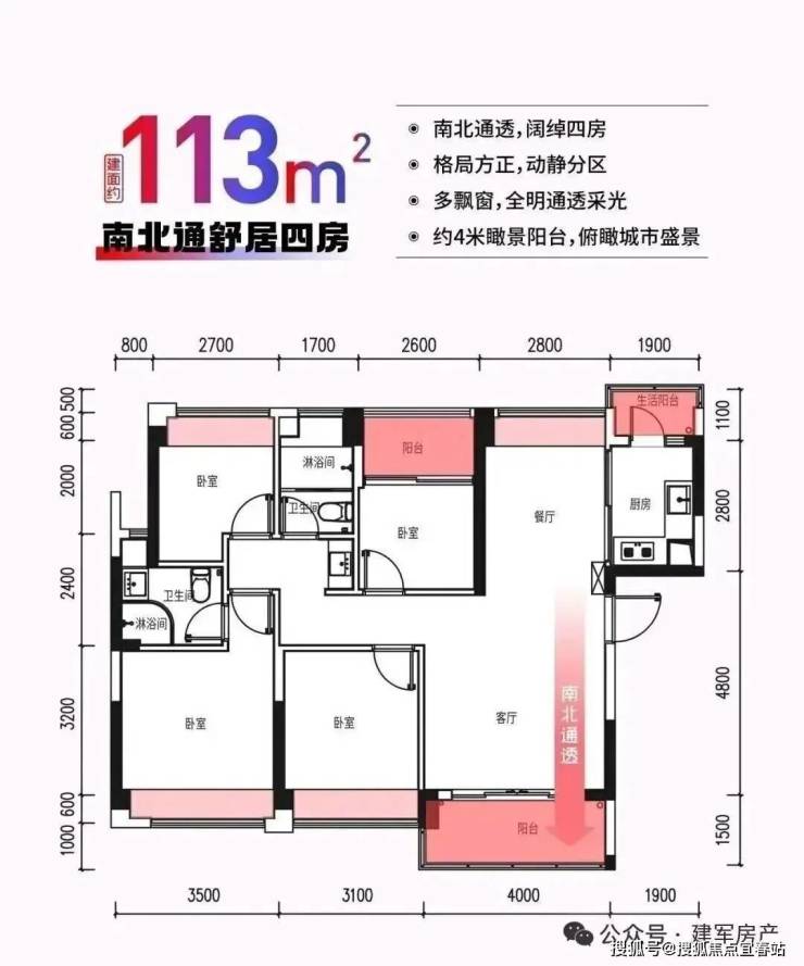 3、户型:建筑面积约113-120㎡四房两厅两卫,稀缺南北通透,三阳台设计,约4米阔景大阳台