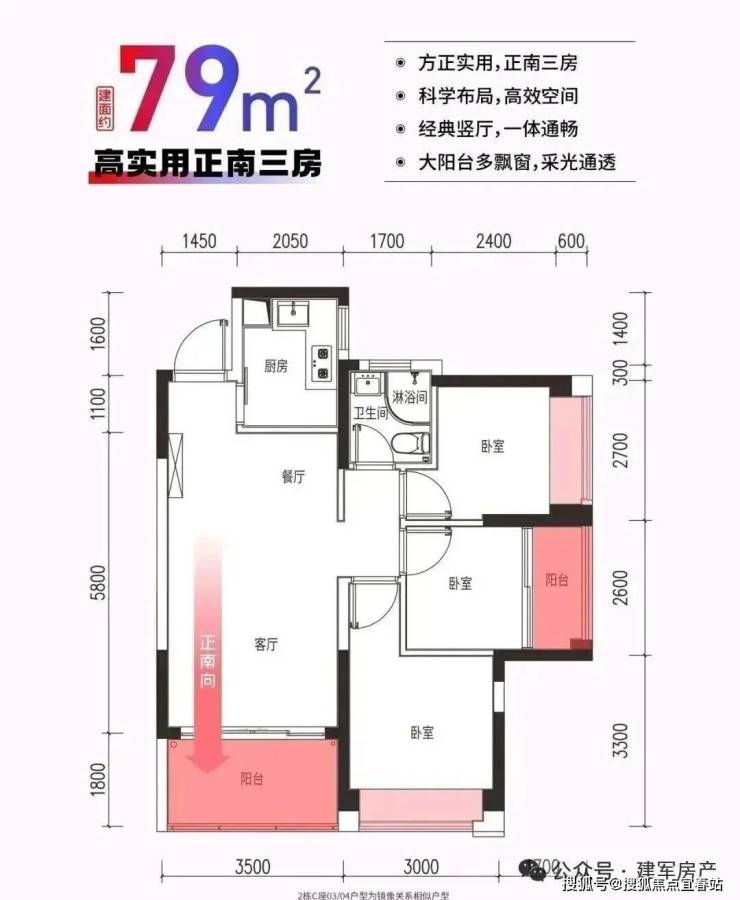 1、户型:建筑面积约78-79㎡极致三房两厅一卫,稀缺高性价比三房
