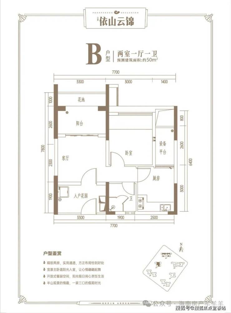 B户型两房一厅一卫: 50㎡送14㎡ 实得64㎡。