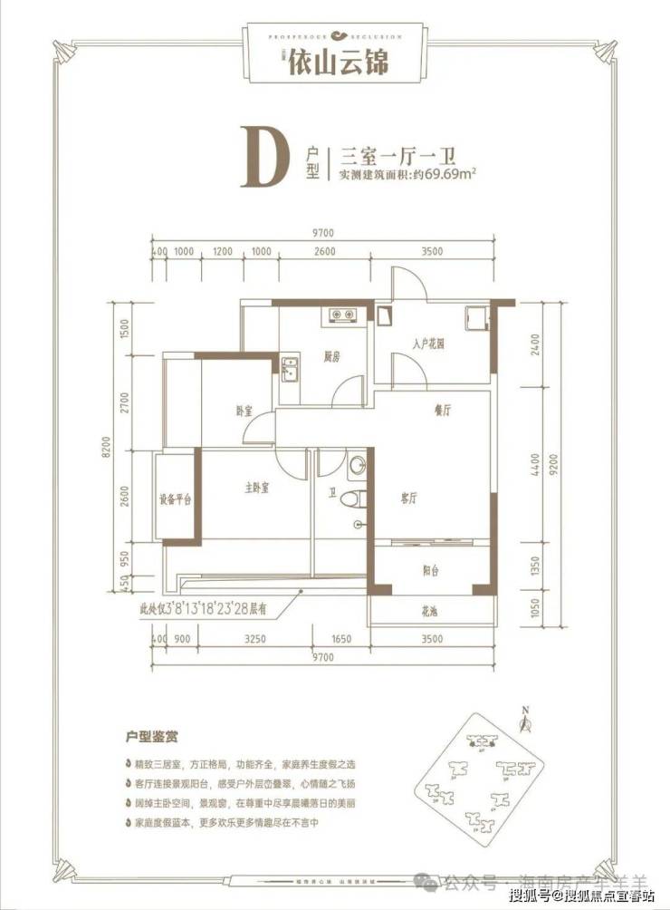D户型三房一厅一卫: 71㎡送23㎡ 实得94㎡。