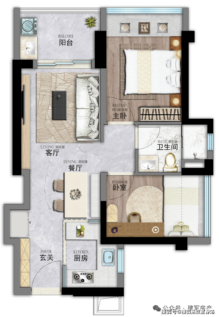 约63㎡2房2厅1卫:竖厅设计,进门入户玄关,S墙设计预留冰箱位,U型厨房,餐客厅一体连接阳台,卫生间干湿分离,阳台西北朝向。