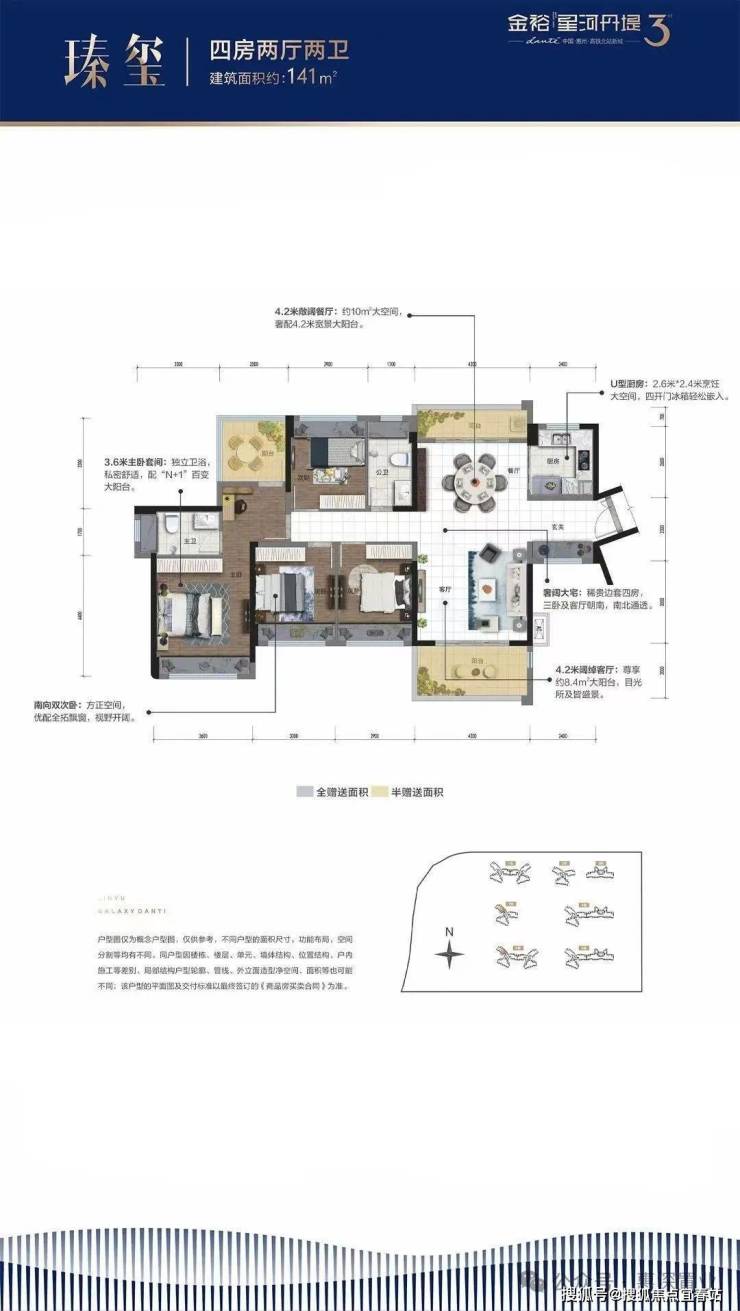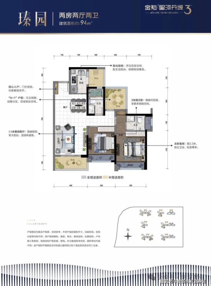 亮点在于所有阳台赠送一半面积,全屋飘窗赠送,实际得房率约82%,在同类产品中属中上水平。